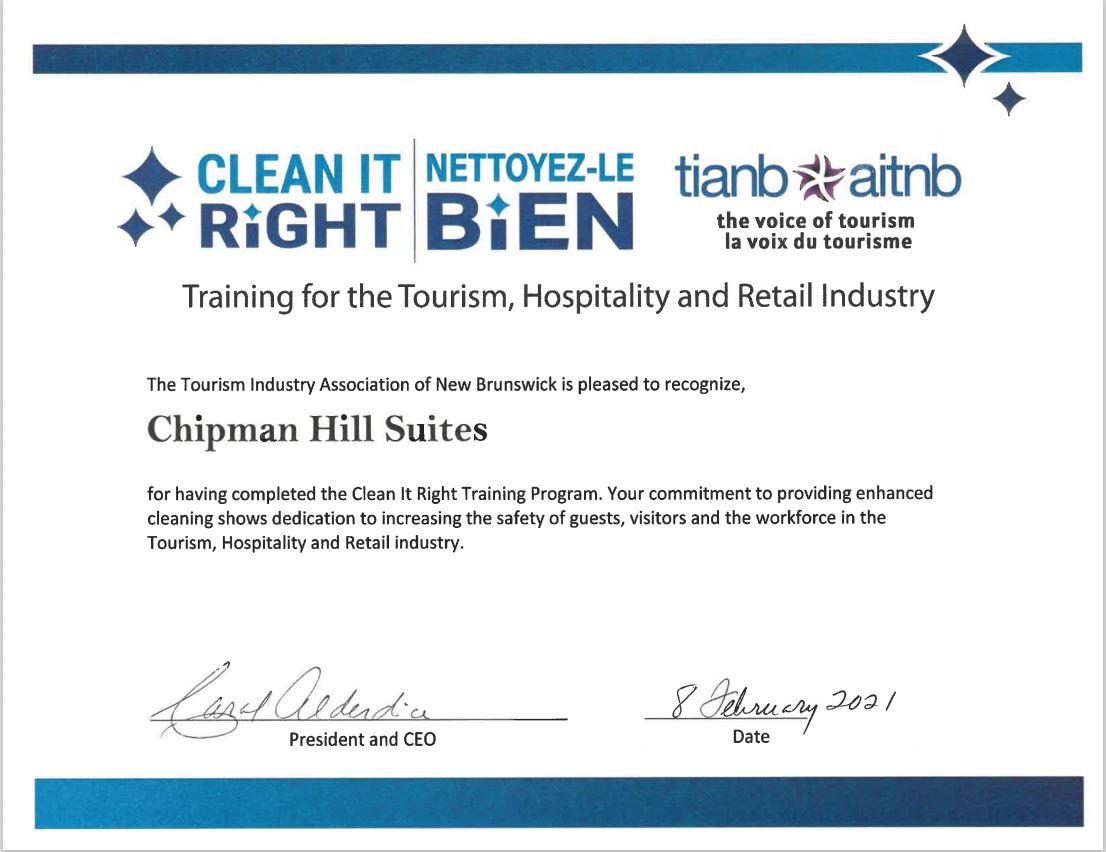 Chipman Hill Suites is strongly committed to ensuring the safety of our guests, visitors, and staff. We are very excited to announce that every member of our staff has completed the “Clean It Right” Training Program offered by TIANB to show our dedication to providing enhanced cleaning measures. This includes our housekeeping team, our maintenance crew AND our office personnel!
